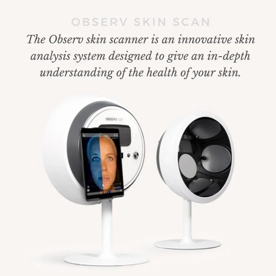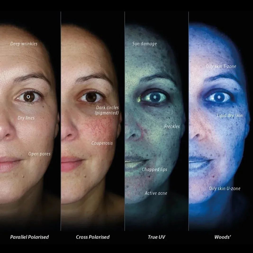 Full in-depth skin health consultation including full skin scan using our computerised skin scanner. Our scanner supplies us with high quality photo images under different spectrums of light. This allows us to fully asses the skin and see in to the deeper layers, showing up things like hydration levels, sun damage and future skin concerns that may arise. This enables us to put the best plan forward for skincare and treatments.